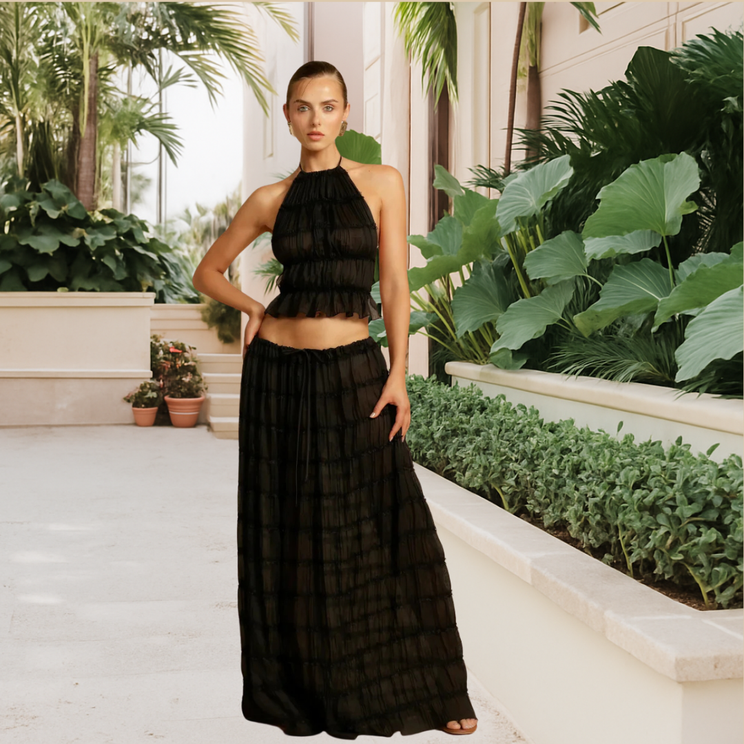Un top femminile accompagnato da un gonna morbida e vaporosa.
